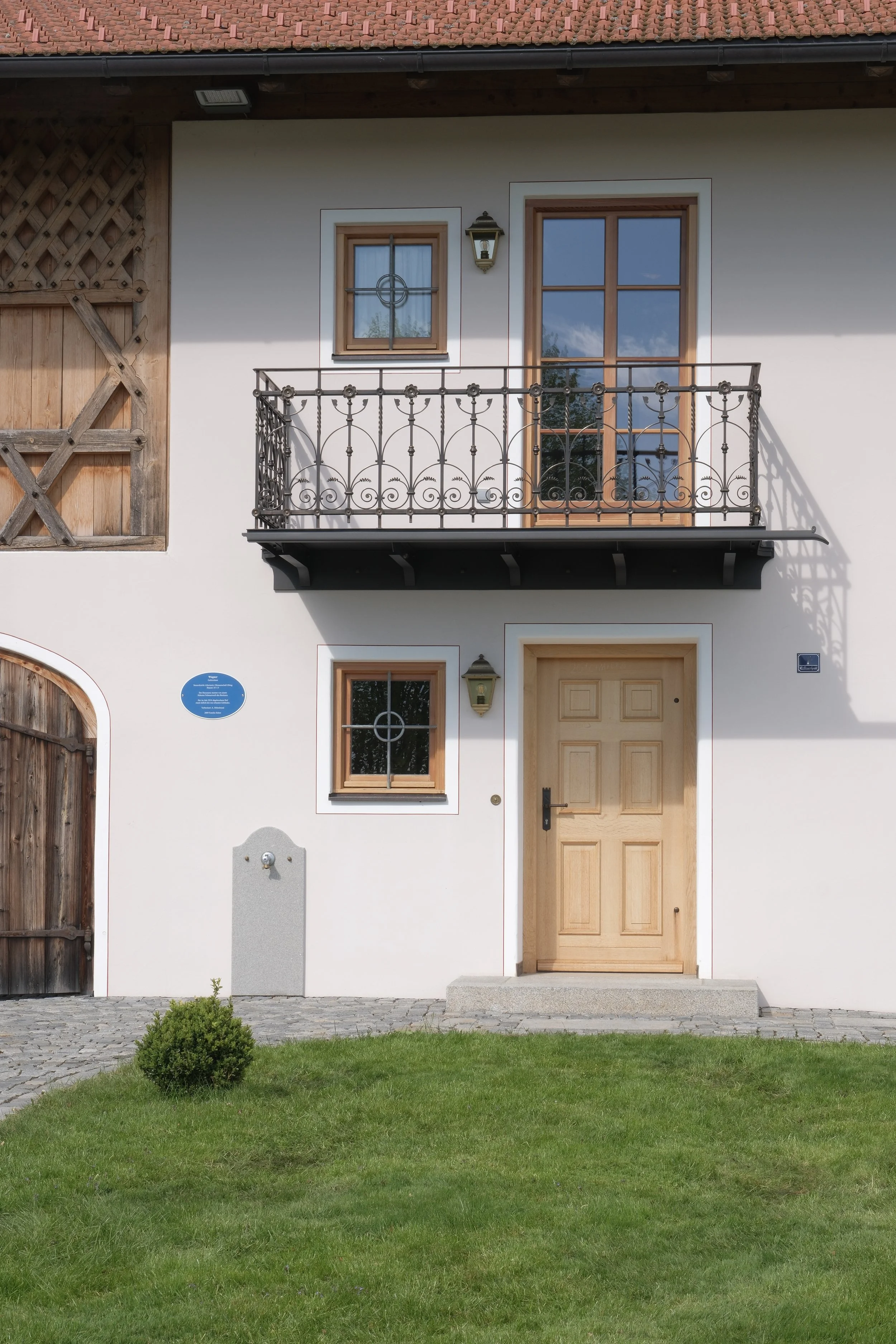 Dieses Geländer kombiniert eine stabile Unterkonstruktion aus Eisen mit einem aus Bronze geschmiedeten Balkongeländer. Die Gestaltung orientiert sich am Stil des Historismus und nimmt Bezug auf die traditionelle Schmiedekunst des oberbayerischen Raums. So entsteht ein langlebiges Bauelement mit Zeitlosen Ausdruck und regionalem Charakter.