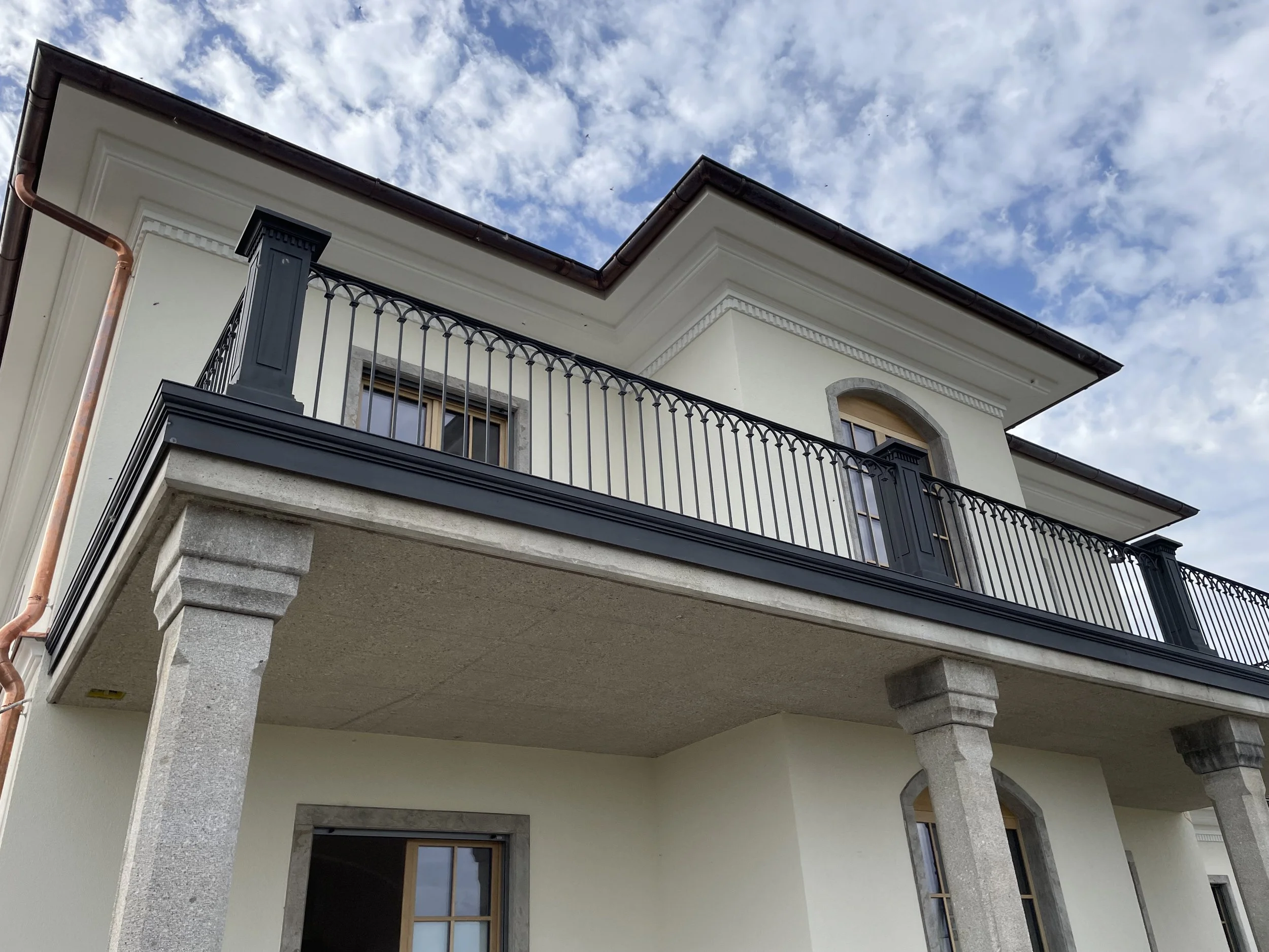 Das klassizistische Balkongeländer erinnert an historische Arkadengänge und besticht durch seine elegante Gestaltung. Die einzelnen Stäbe sind als Säulen mit Kapitellen nachempfunden und werden durch Halbrundbögen verbunden. Zwischen den Geländern befinden sich große Eisenpfeiler, die die Formensprache der darunter liegenden Säulen und des Hauses harmonisch weiterführen.