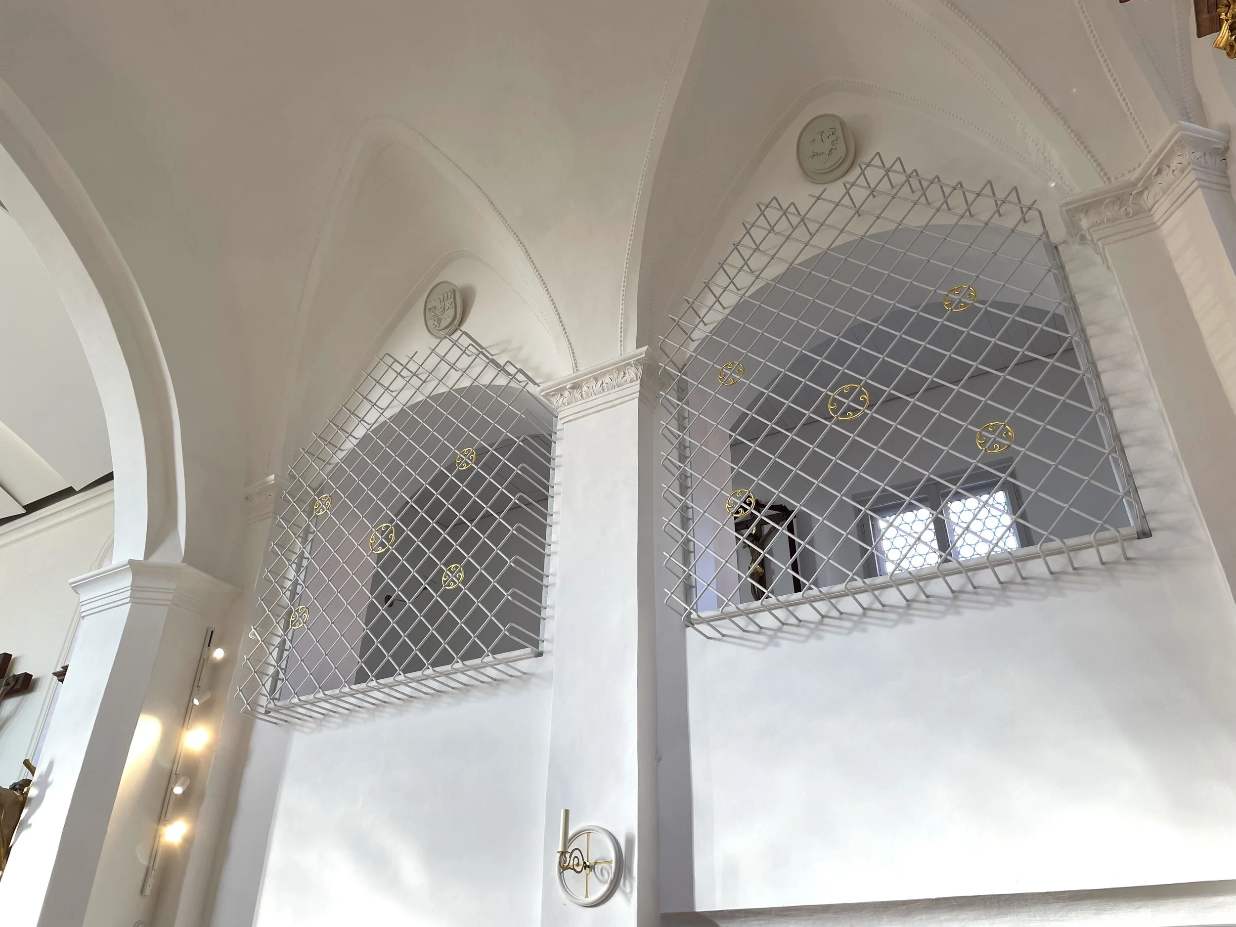 Ein Oratoriumgitter in St. Nikolaus Haimhausen mit handgetriebenen Schmiedelochungen und vergoldeten Zierelementen.
